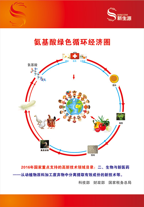 湖北新生源公司采用水解工藝生產(chǎn)的小品種系列氨基酸被國家科技部、商務(wù)部、財政部、國家稅務(wù)總局、海關(guān)總署等五部委列為“中國高新技術(shù)出口產(chǎn)品”。2013年度湖北省重大科技創(chuàng)新計劃(成果轉(zhuǎn)化類)申報指南中將“氨基酸類原料藥產(chǎn)品開發(fā)”列入財政支持科技項目。2016年“高新技術(shù)企業(yè)認定管理辦法”——“國家重點支持的高新技術(shù)領(lǐng)域”將“從動植物原料加工廢棄物中進一步分離提取有效成分的新技術(shù)”列入。水解提取法生產(chǎn)氨基酸符合這一特征。